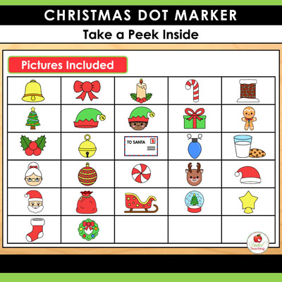 - Each worksheet features a Christmas-themed image designed for dot marker painting