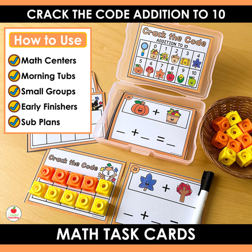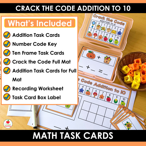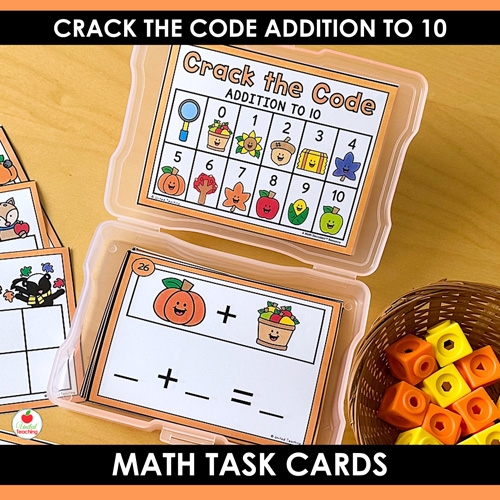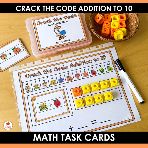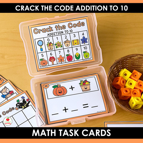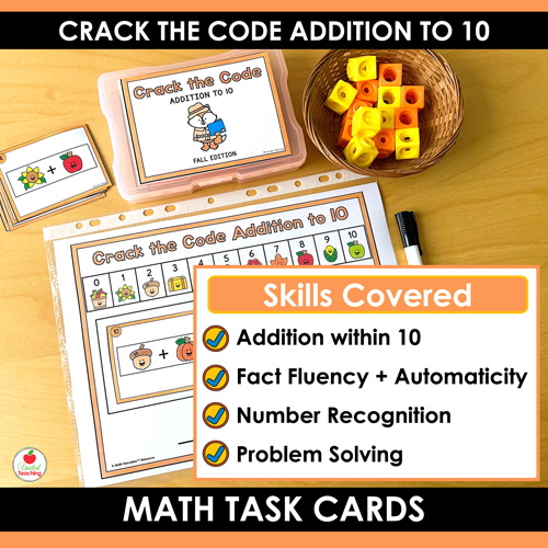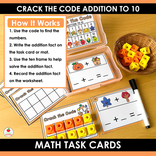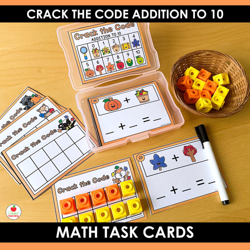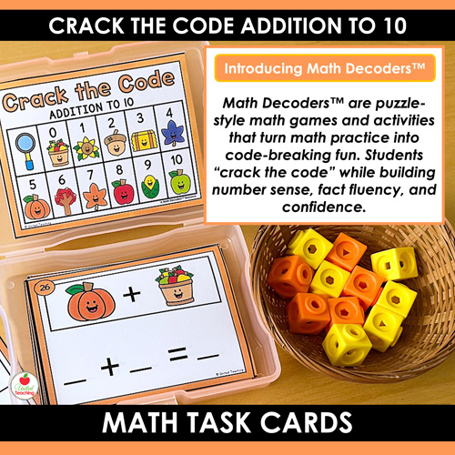 Bring seasonal fun to your math centers this fall while mastering addition facts within 10 with these Crack the Code Math Task Cards — part of the Math Decoders™ series.