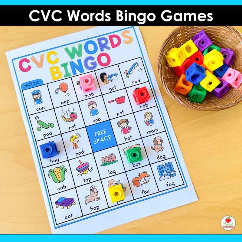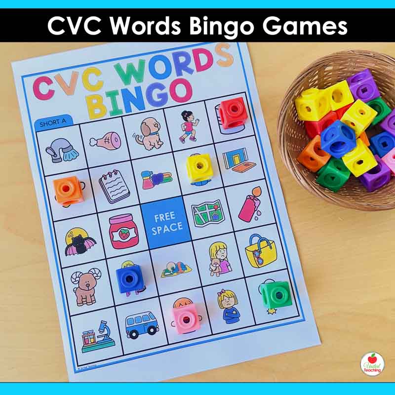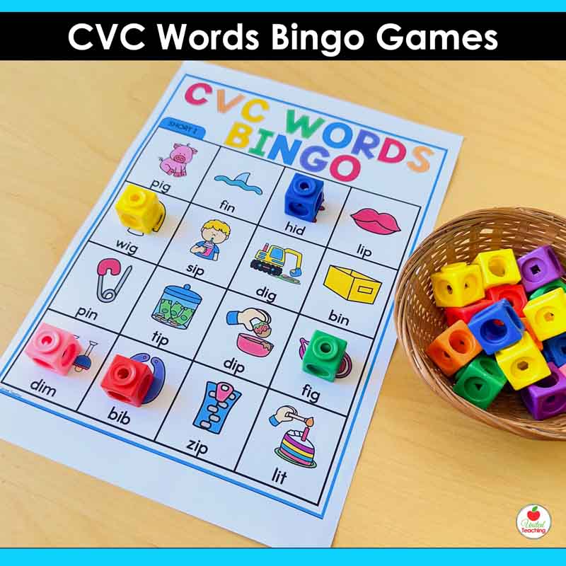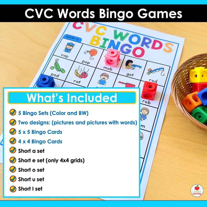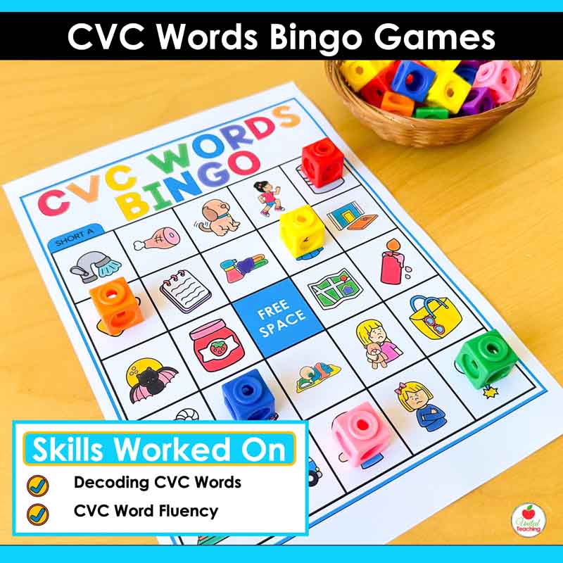 • Word reading built in: Bingo cards come in two designs showing just a picture or showing a picture paired with the written CVC word