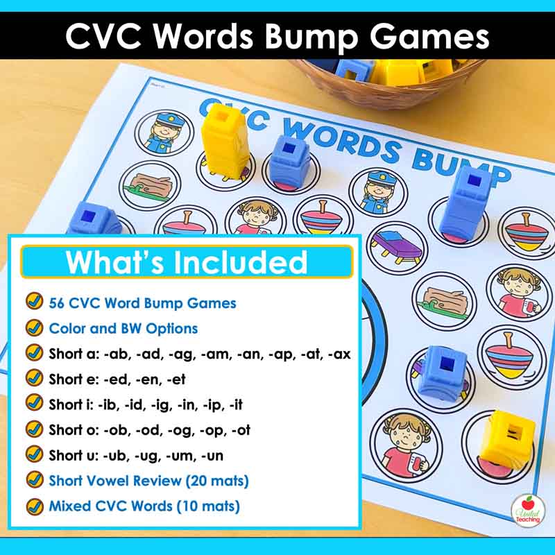 With 56 unique game mats organized into word families, short vowels, and mixed CVC words, there is a mat for every stage of CVC instruction.