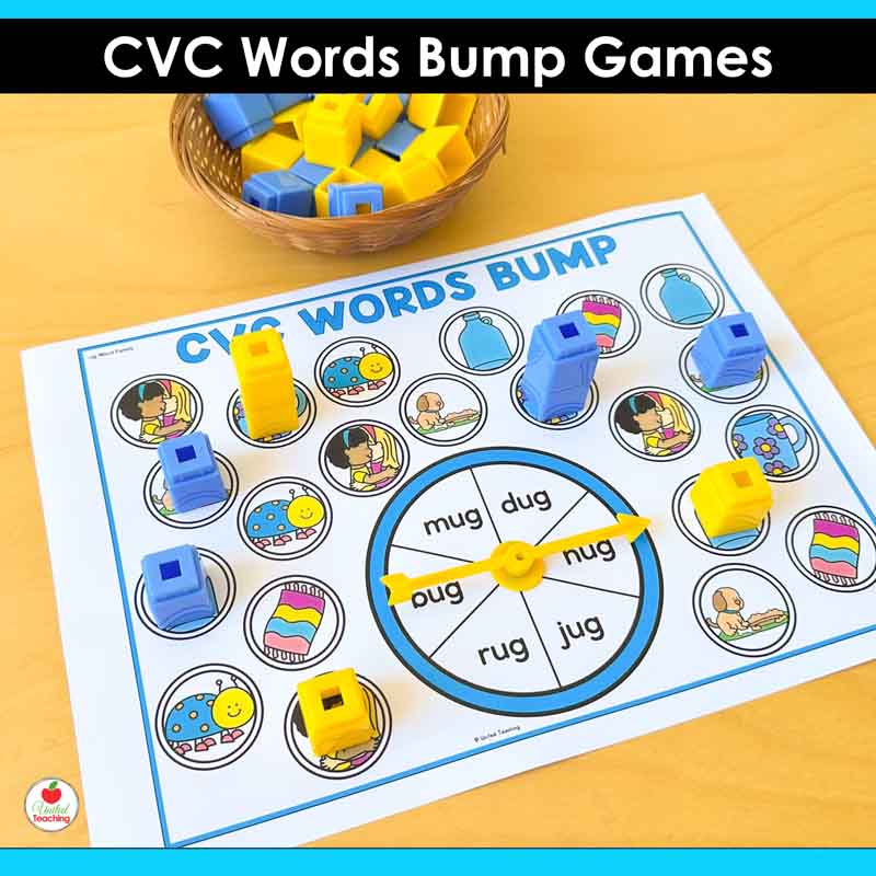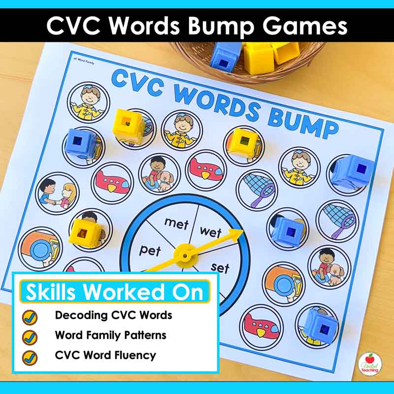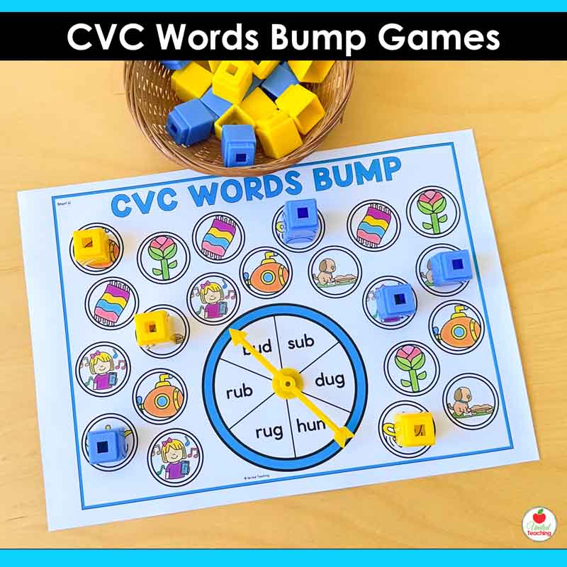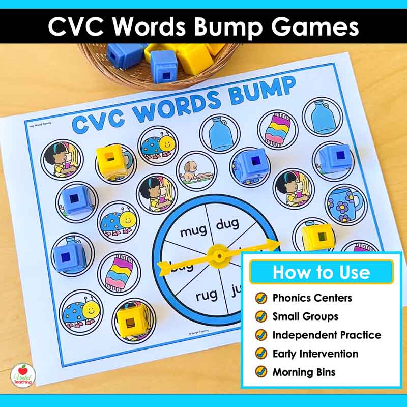 These Science of Reading-aligned CVC Words Bump Games get students reading CVC words over and over without it ever feeling like a drill. Spin a word, read the word, and cover it with a counter. If your partner is already there, bump them off. If you’ve got two counters on the same word, it’s locked and they can’t touch it.