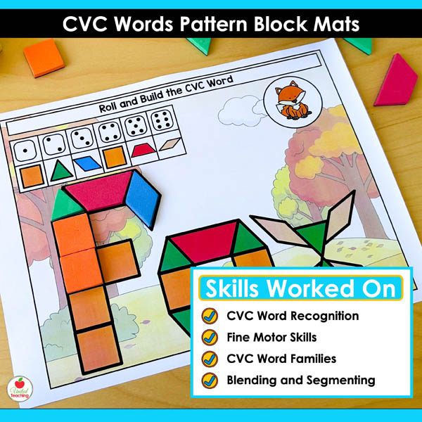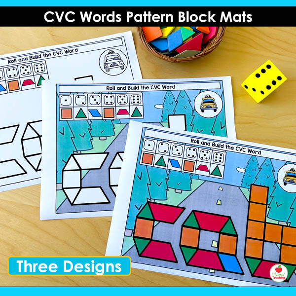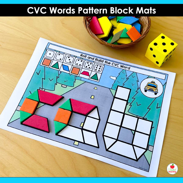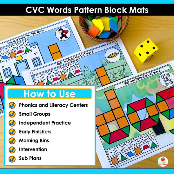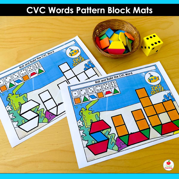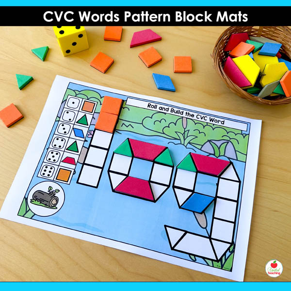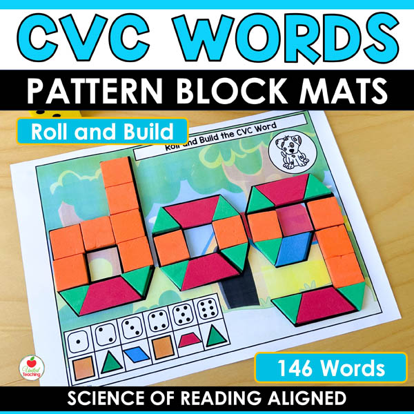 Need hands-on CVC practice that keeps students engaged? These pattern block mats turn phonics into a tactile building game. Students roll, build, and read 146 different CVC words.