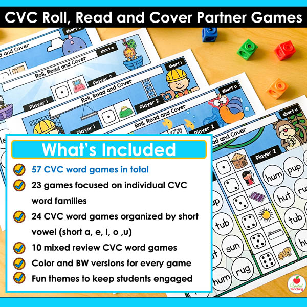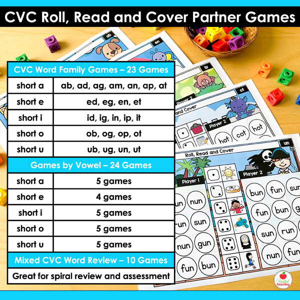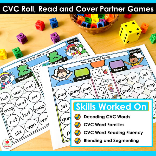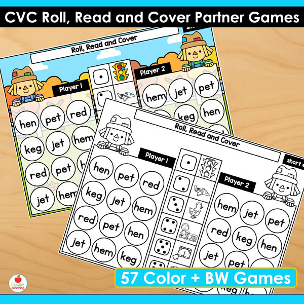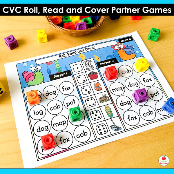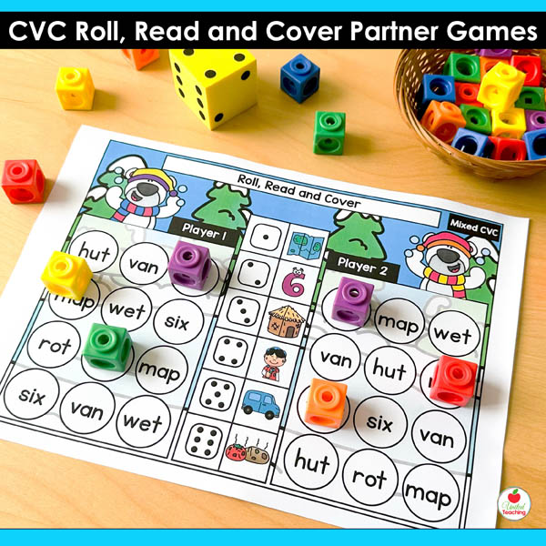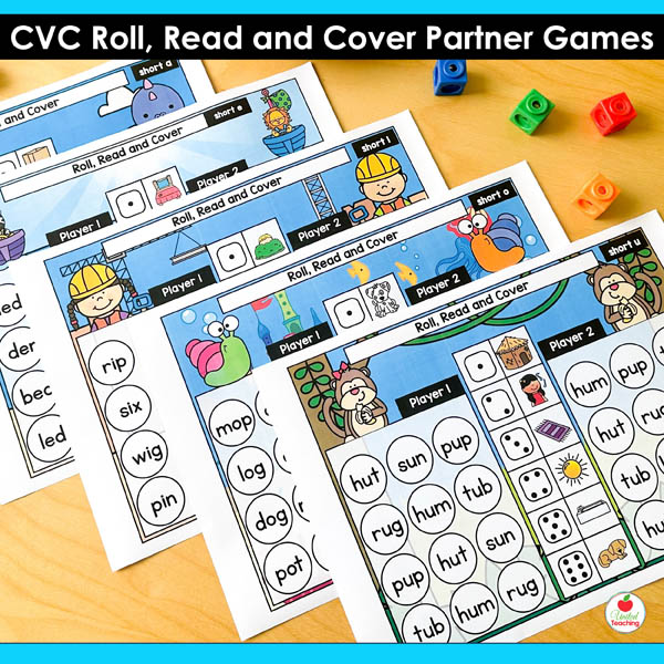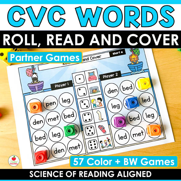 The CVC Words Roll Read and Cover Partner Games give you 57 competitive dice games targeting all CVC short vowel patterns. These small group games use a simple routine – roll a die, read the matching CVC word and cover it on your board. First player to cover all words wins. Perfect for literacy centers, small groups, and intervention.
