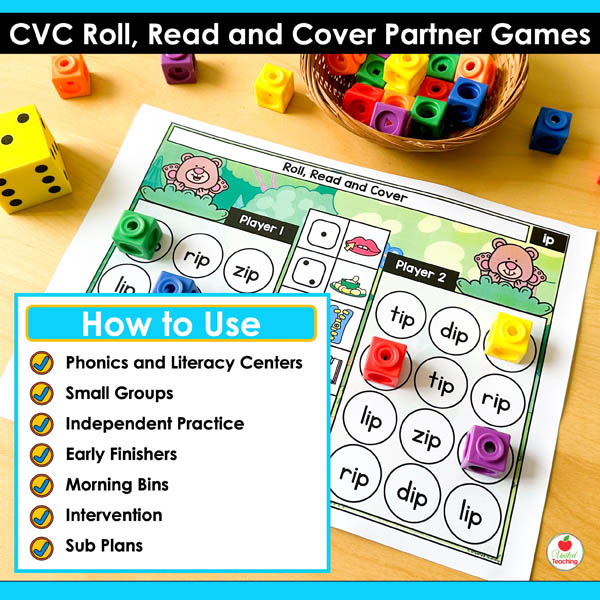 Dice games tap into students’ natural love of games, turning routine CVC practice into something they actually want to play. Students roll the die, identify the picture, then race to find and read the matching word on their board.