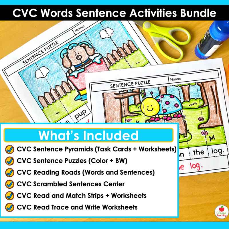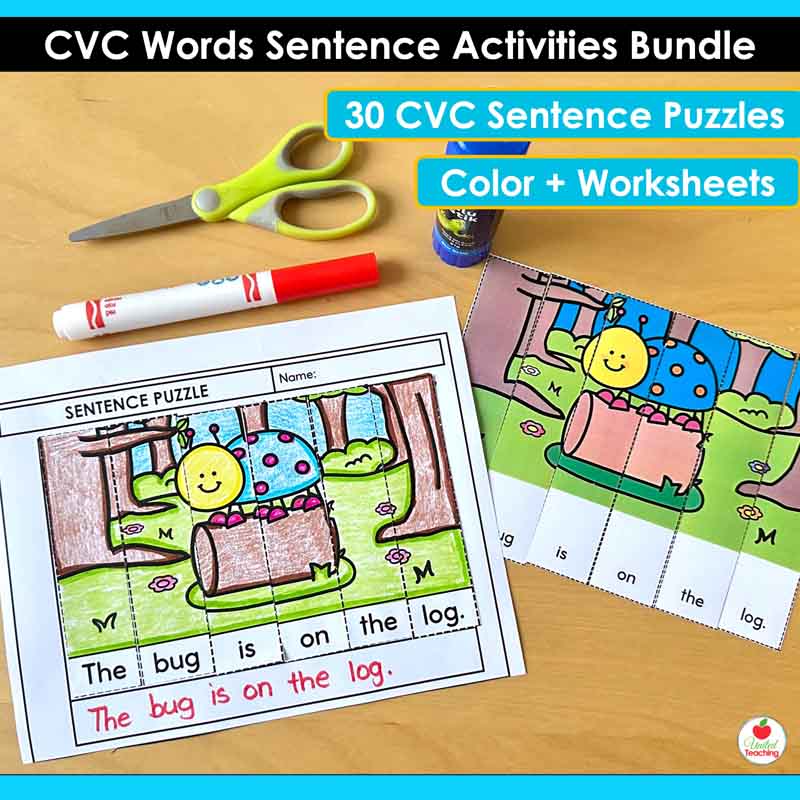 2. CVC Sentence Puzzles:Â 30 color puzzles + 30 BW worksheets