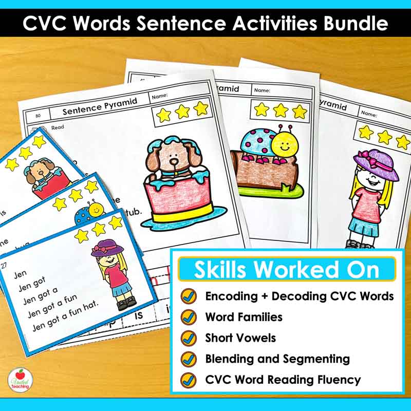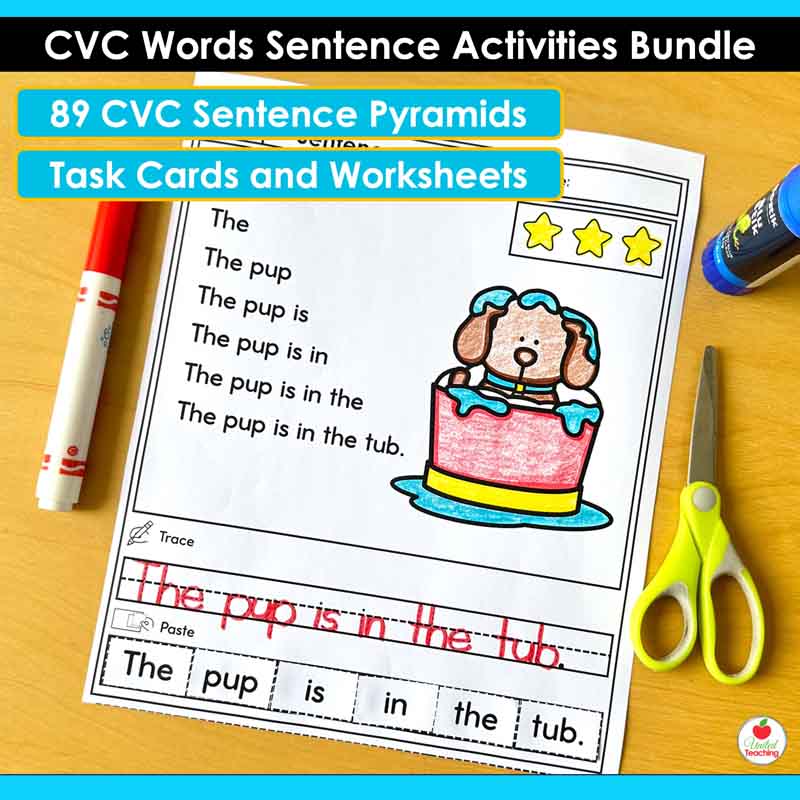 1. CVC Sentence Pyramids:Â 89 task cards + 89 matching worksheets