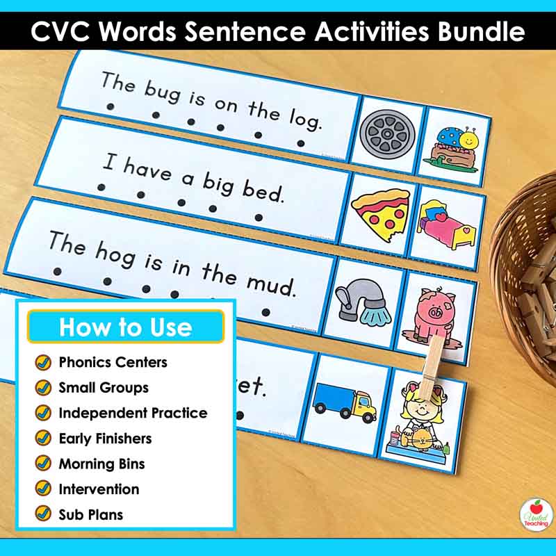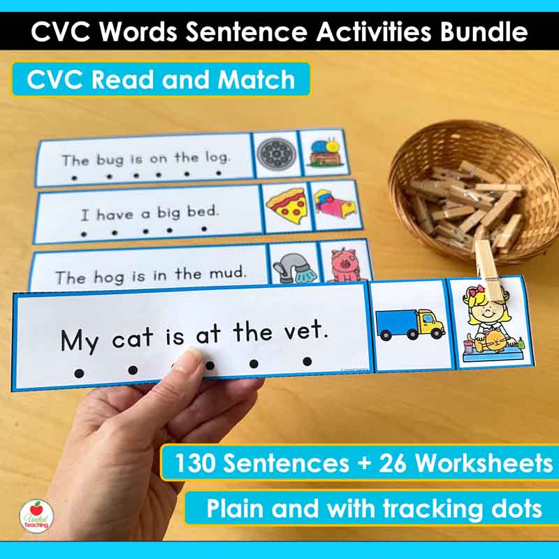 5. CVC Read and Match Sentence Strips:Â 130 sentence strips + 26 worksheets Two versions included: Plain and tracking dots. Students read the sentence strip and clip a clothespin onto the matching picture. Worksheets provide a written accountability option.