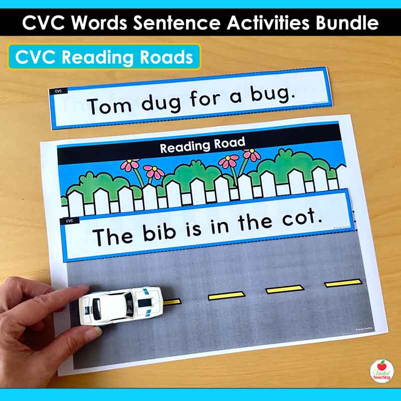 3. CVC Reading Roads : 9 road mats + 75 word strips + 100 sentence strips Students drive a toy car along the road mat while reading CVC word strips and sentence strips aloud, building decoding accuracy and fluency through repeated, engaging practice.
