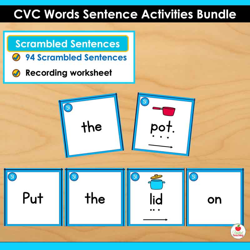 4. CVC Scrambled Sentences:Â 94 sentence sets + recording worksheet Students unscramble a set of word cards to build a decodable CVC sentence, then write the completed sentence on the recording worksheet. Phoneme dots and blending arrows on every CVC word card fur support.