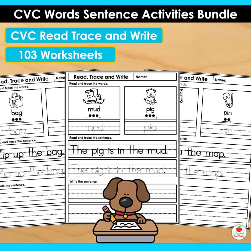 Students read and trace two key CVC words first, then read and trace the complete sentence, then write it independently; a structured three-step sequence on every page.