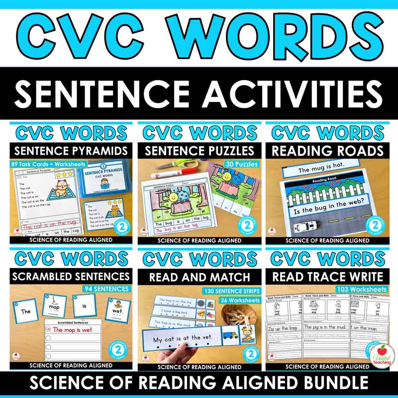 Give your students sentence-level CVC practice that never gets stale. This Science of Reading-aligned CVC Words Sentence Activities Bundle brings together six different sentence activities – hands-on centers, worksheets, and fluency tools, all built around decodable CVC sentences across all five short vowels.