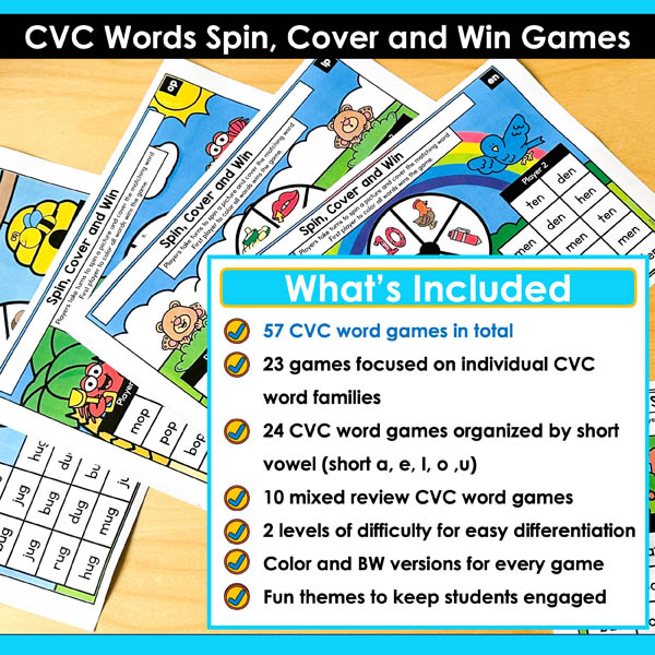 What’s Included in the CVC Words Spin Cover and Win Packet