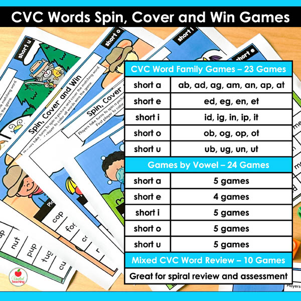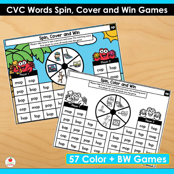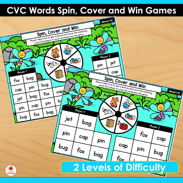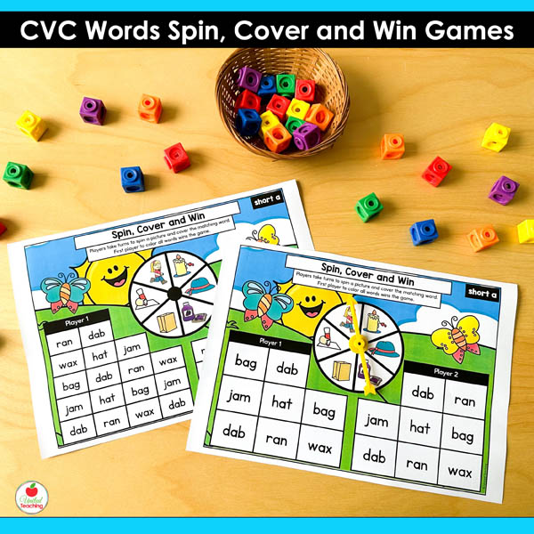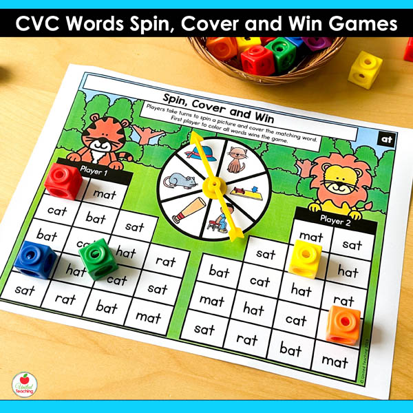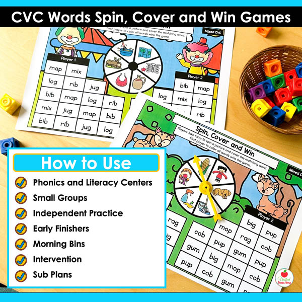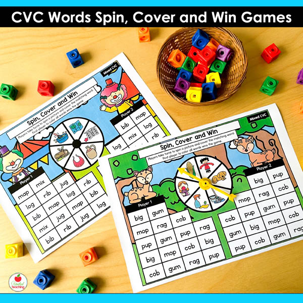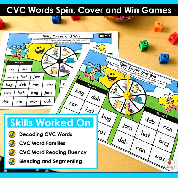 The CVC Words Spin Cover and Win Games are competitive partner games targeting all CVC short vowel patterns. These games combine systematic CVC practice with the motivation of trying to win. Students spin, read, and cover words on their boards. First player to cover their CVC words wins. The simple routine means partners can play independently while you work with small groups.