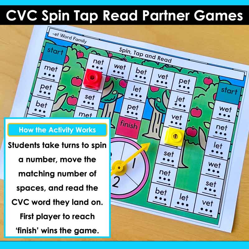 These Science of Reading-aligned CVC Words Spin Tap and Read Partner Games give you a ready-to-run phonics center where students practice blending, segmenting, and decoding CVC words. Players take turns spinning a number, moving along their path, and reading the CVC word they land on while racing from START to FINISH on the same game board.