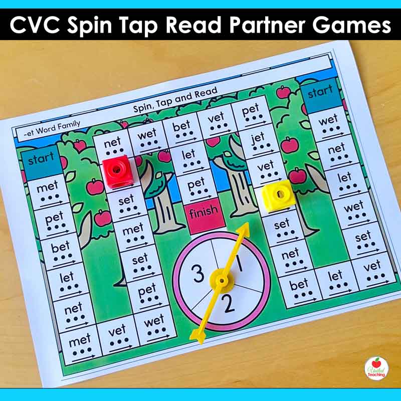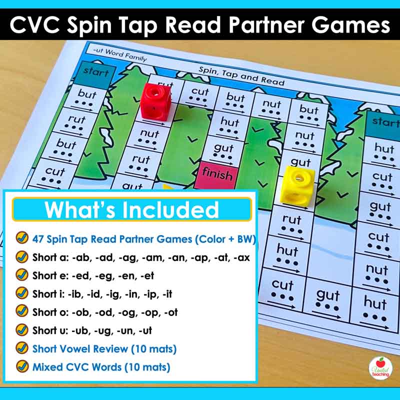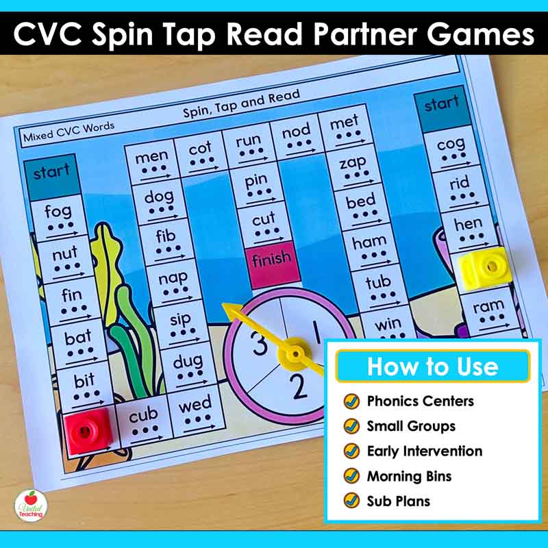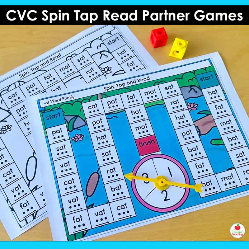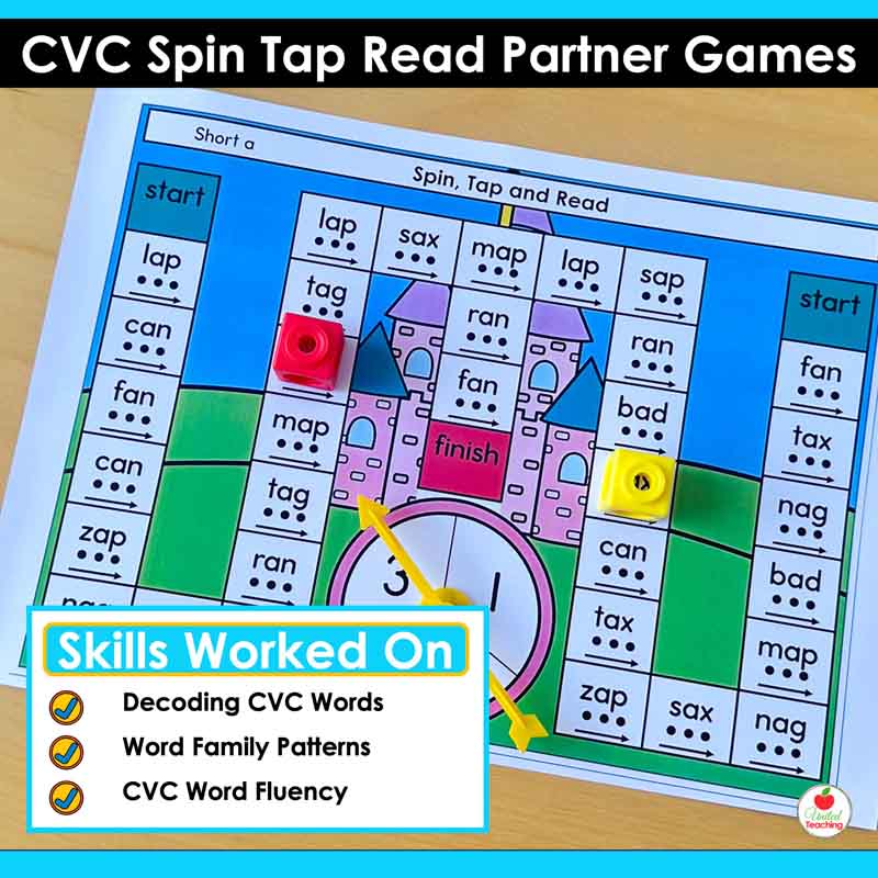If you are teaching CVC words and want a partner game that reinfoces decoding and blending, these Spin, Tap and Read mats give you 47 ready-to-use games in color and black-and-white, covering every word family and short vowel.
