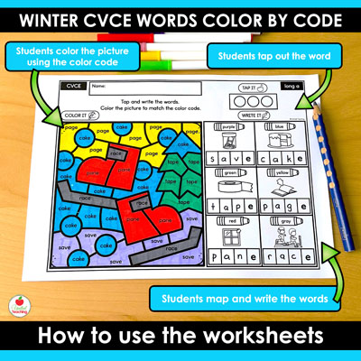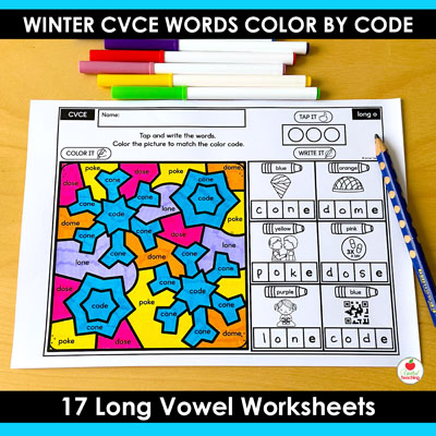 Make CVCE word practice fun and effective with the Winter Color by Code CVCE Worksheets – a timesaving, hands-on way to build strong readers through phonics and word mapping.