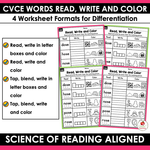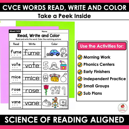 Support your students in mastering long vowel sounds with these CVCE Read, Write, and Color Worksheets!Perfect for explicit phonics instruction, these worksheets give students meaningful practice with blending, reading, and writing CVCE words – all aligned with the Science of Reading.