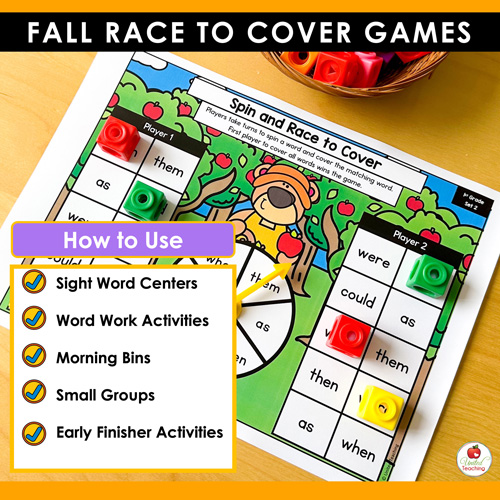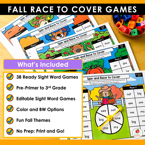 • 38 Fall-Themed Game Mats featuring high-frequency sight words from:
