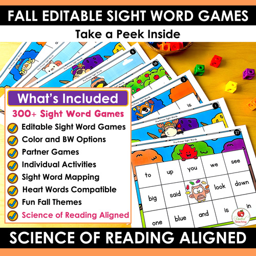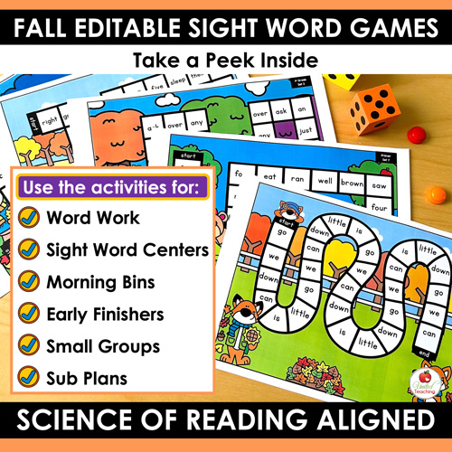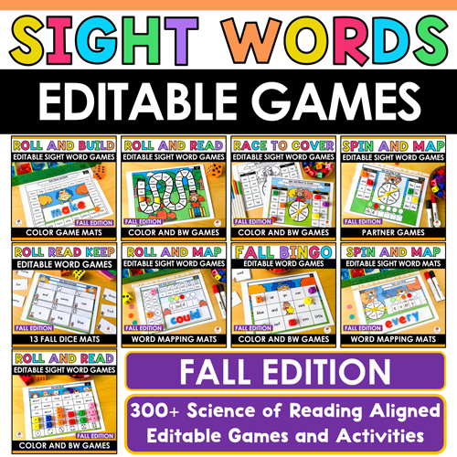 Looking for an easy way to keep sight word practice engaging this fall? Make sight word practice hands-on, customizable, and fun this autumn with the Science of Reading aligned Fall Sight Words Editable Games Bundle! Packed with a variety of interactive, fall-themed literacy games, this bundle helps students build sight word fluency through repeated exposure and multisensory learning. Every activity is fully editable, giving you the flexibility to match instruction to your classroom’s exact sight word and phonics word lists.