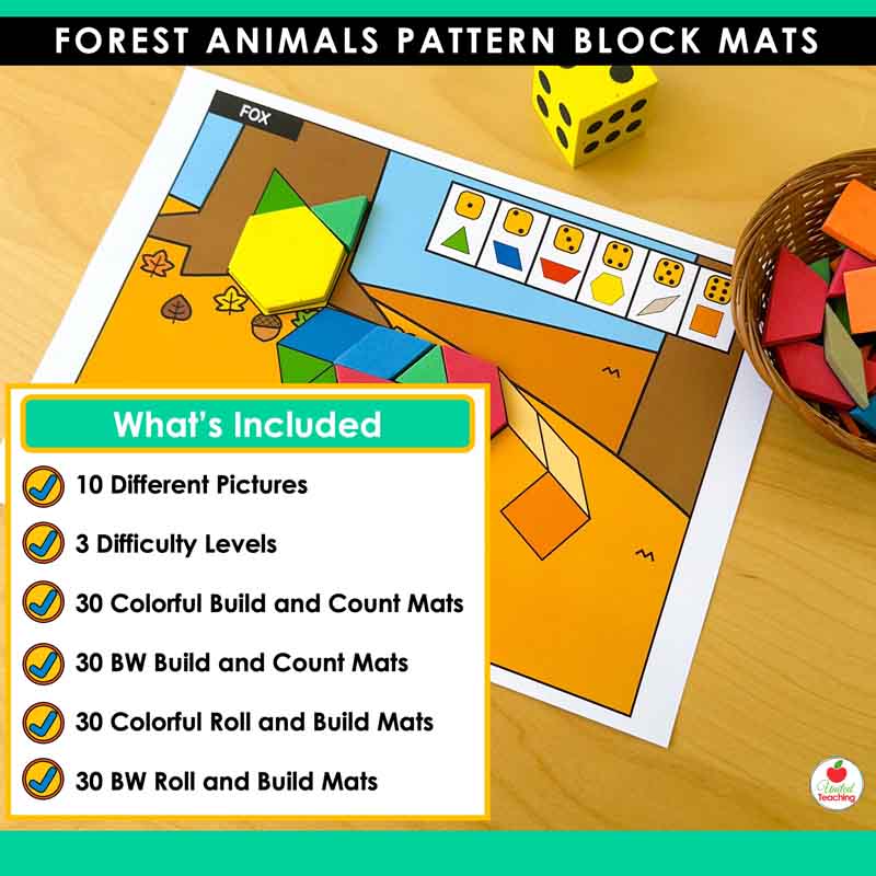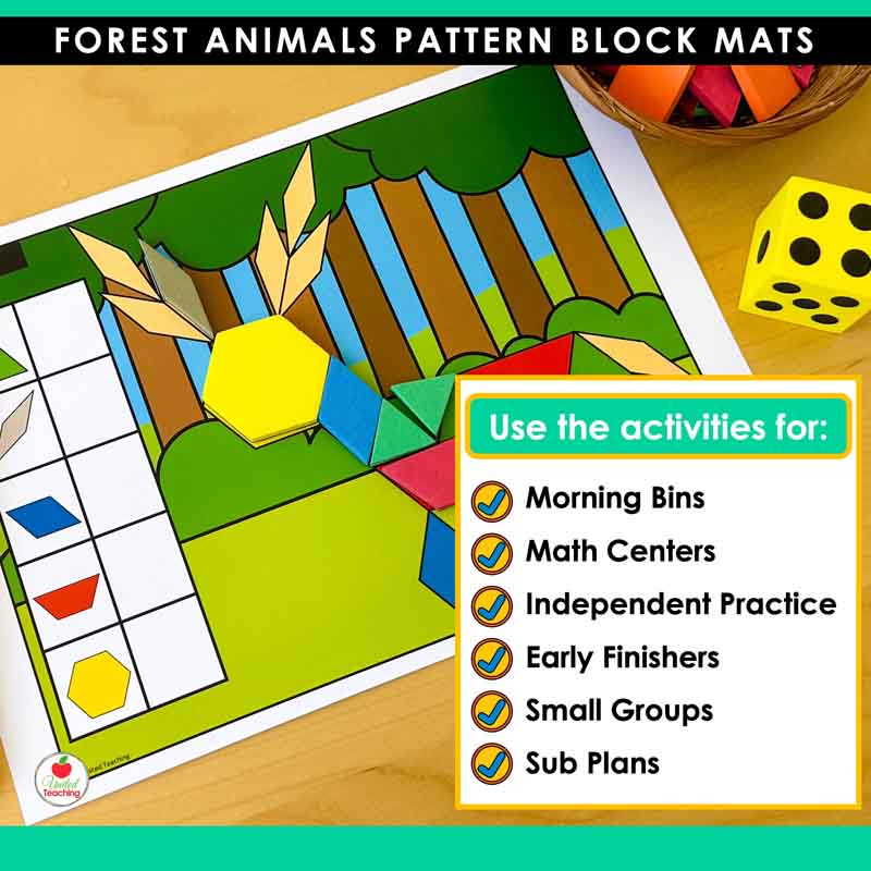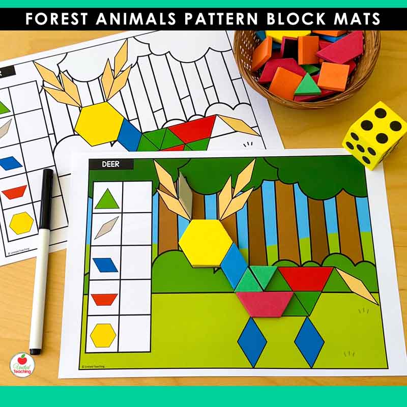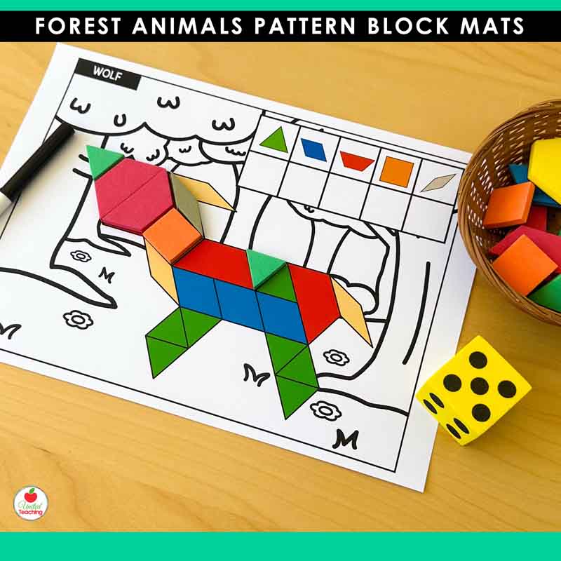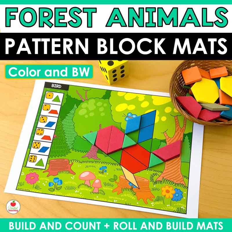 Bring the forest to your math centers with these engaging pattern block mats featuring favorite woodland animals. This forest-themed pattern blocks collection includes 10 animal designs with built-in differentiation, giving your preschool and kindergarten students hands-on practice with shapes, counting, and fine motor skills. Just print, add pattern blocks and a dice, and you’re ready for math centers that students will love.