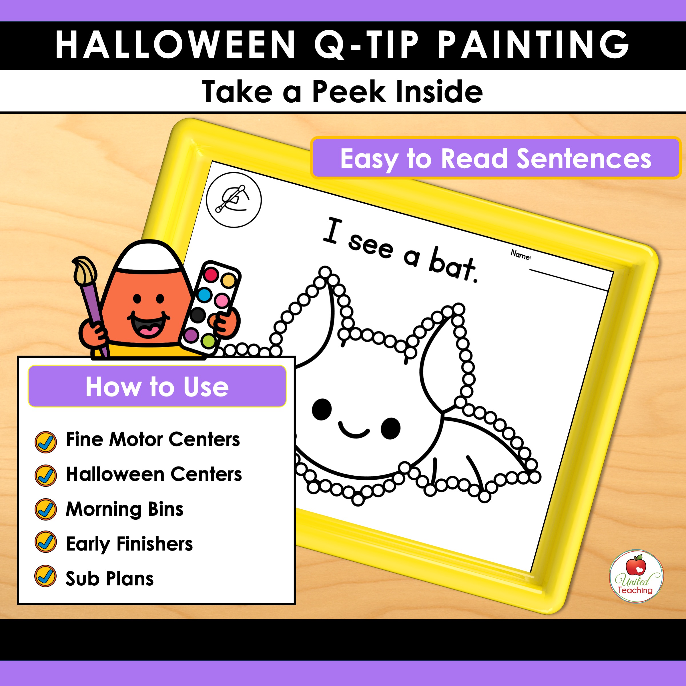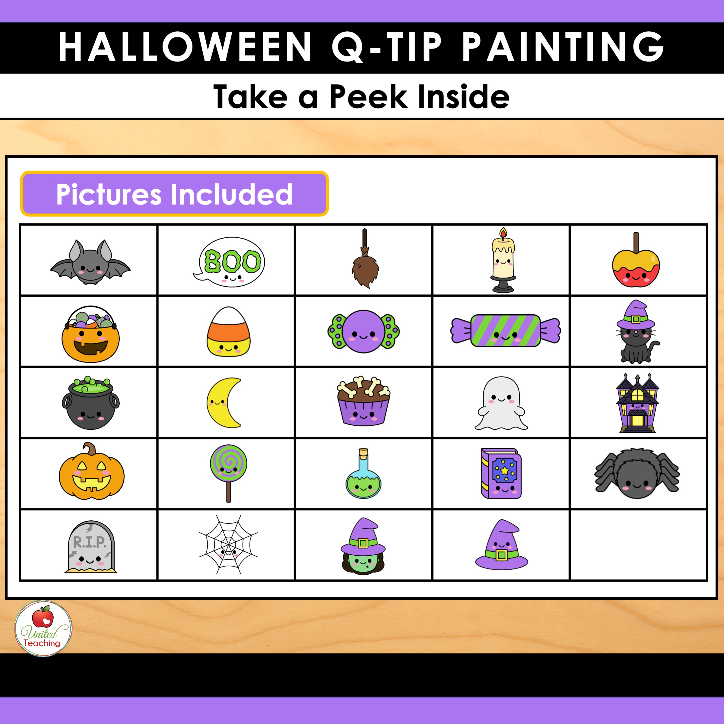 • Each worksheet features a Halloween-themed image for q-tip painting
