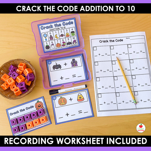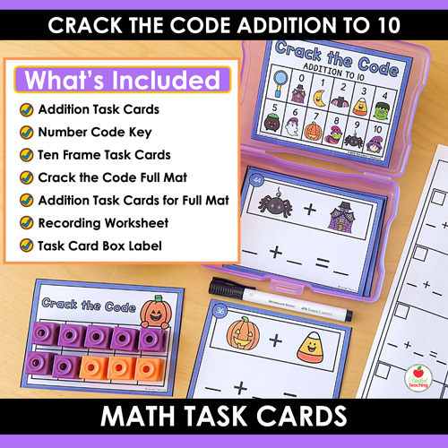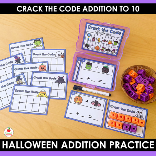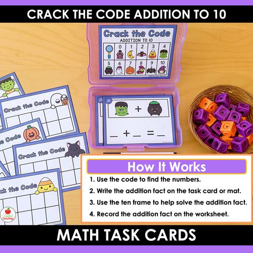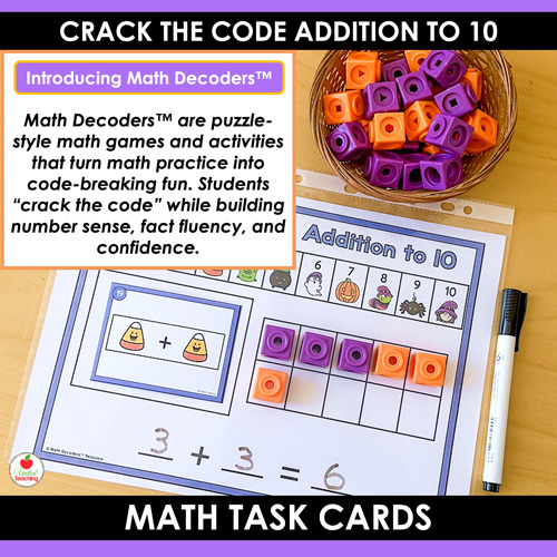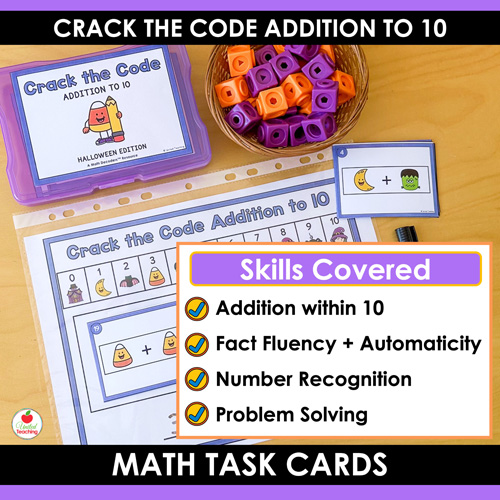 Bring holiday fun to your math centers this Halloween while mastering addition facts within 10 with these Crack the Code Math Task Cards — part of the Math Decoders™ series.