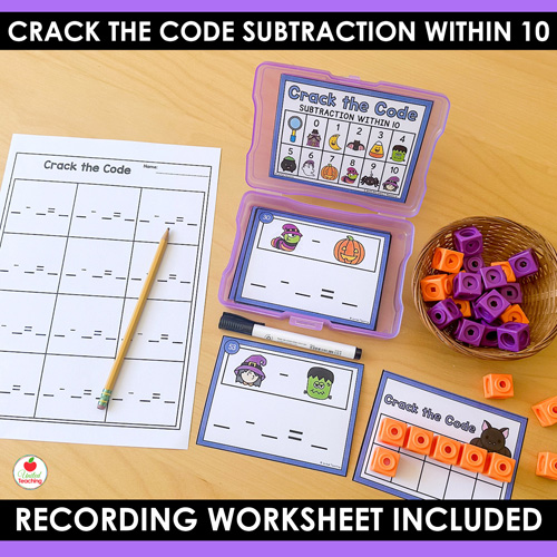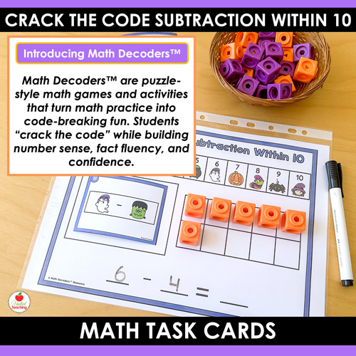 Math Decoders™ are puzzle-style math games that turn subtraction practice into code-breaking fun. In this Halloween-themed set, students solve subtraction facts within 10 by matching picture codes to numbers, completing the equation, and recording their answers. The consistent routine helps students build fluency, independence, and confidence while enjoying seasonal math practice.