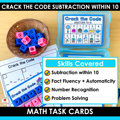 Turn subtraction practice into a puzzle with Math Decoders™ Winter Crack the Code Subtraction within 10! These winter-themed math task cards transform subtraction within 10 into a fun code-breaking game. Students use picture codes with snowman, mittens, and winter icons to build and solve equations, making practice hands-on and engaging for Kindergarten and 1st Grade.