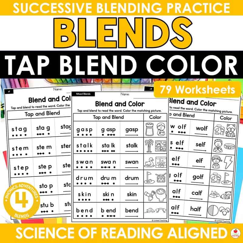• Blends Tap Blend and Color (79 worksheets) – beginning L-, R-, and S-blends, ending blends, and mixed review