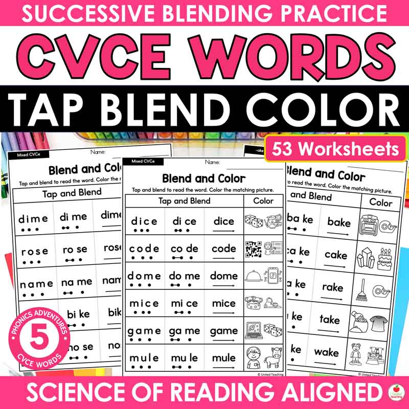 • CVCe Tap Blend and Color (53 worksheets) – long vowel patterns a_e, i_e, o_e, u_e, e_e and mixed review