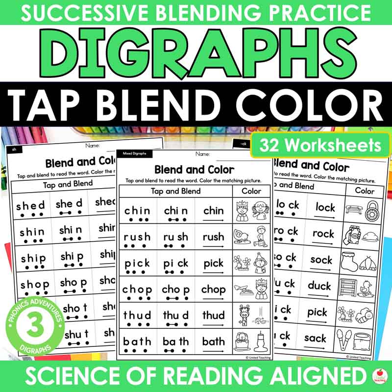 • Digraphs Tap Blend and Color (32 worksheets) – beginning and ending digraphs including ch, sh, th, wh, kn, -ck, -sh, -ng, and mixed review