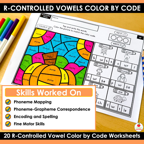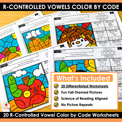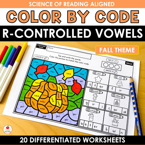 Looking for a fun, structured way to practice phonics that aligns with the Science of Reading? The R-Controlled Vowels Color by Code Fall Worksheets Packet combines phonics word mapping with engaging fall color by code activities. Students strengthen their decoding, encoding, and word recognition skills while enjoying interactive seasonal practice. With 20 worksheets covering r-controlled vowels, you’ll have everything you need to support reading fluency.