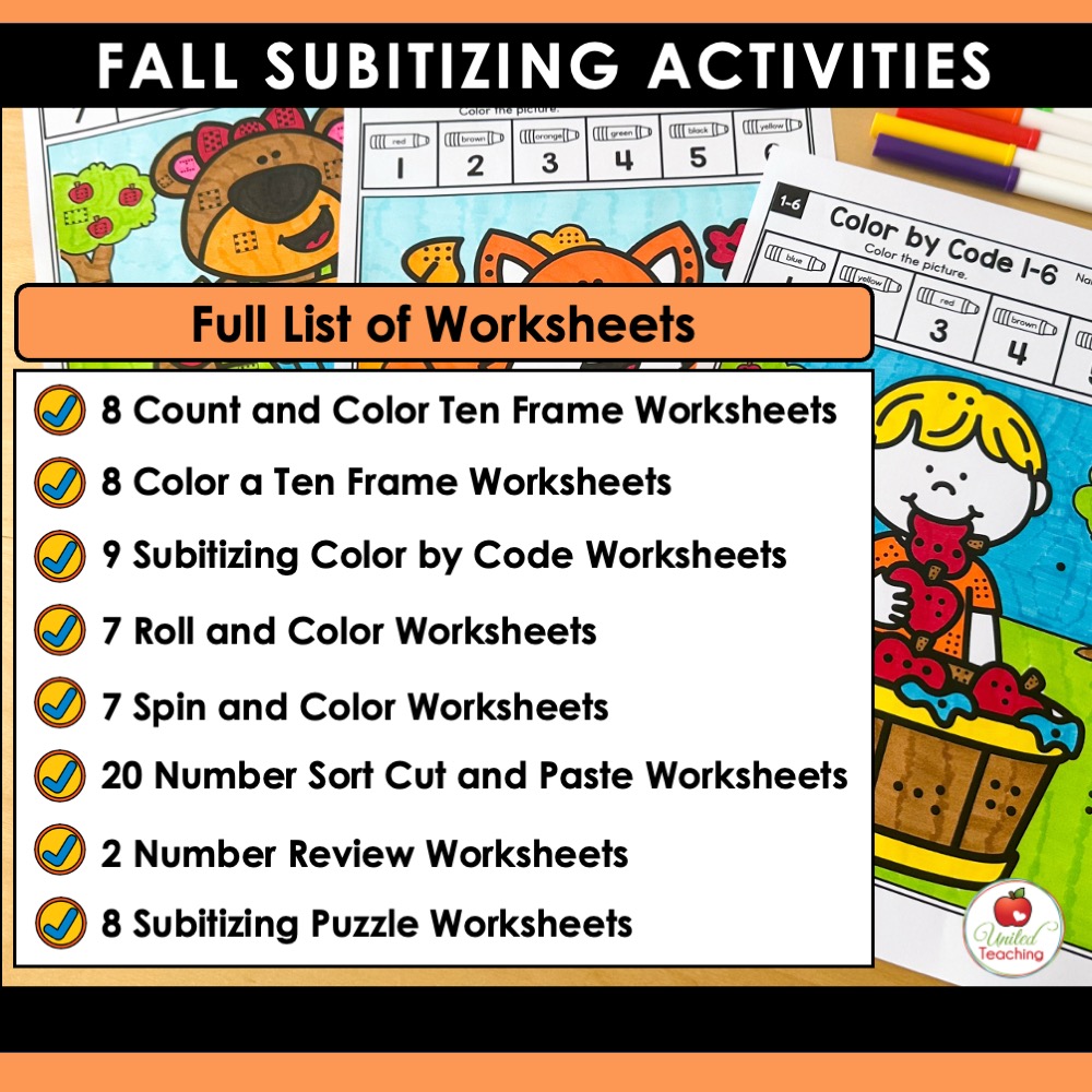 • 69 Fall Math Worksheets for reinforcing number sense and subitizing skills
