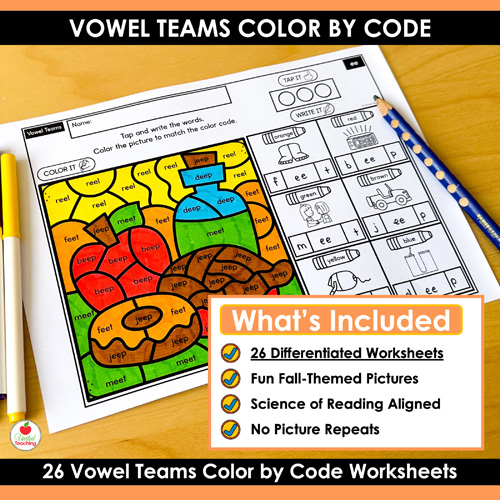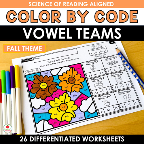 Looking for a fun, structured way to practice phonics that aligns with the Science of Reading? The Vowel Teams Color by Code Fall Worksheets Packet combines phonics word mapping with engaging fall color by code activities. Students build their decoding, encoding, and word recognition skills while enjoying interactive seasonal practice. With 26 worksheets covering a variety of vowel teams, you’ll have everything you need to support reading fluency.