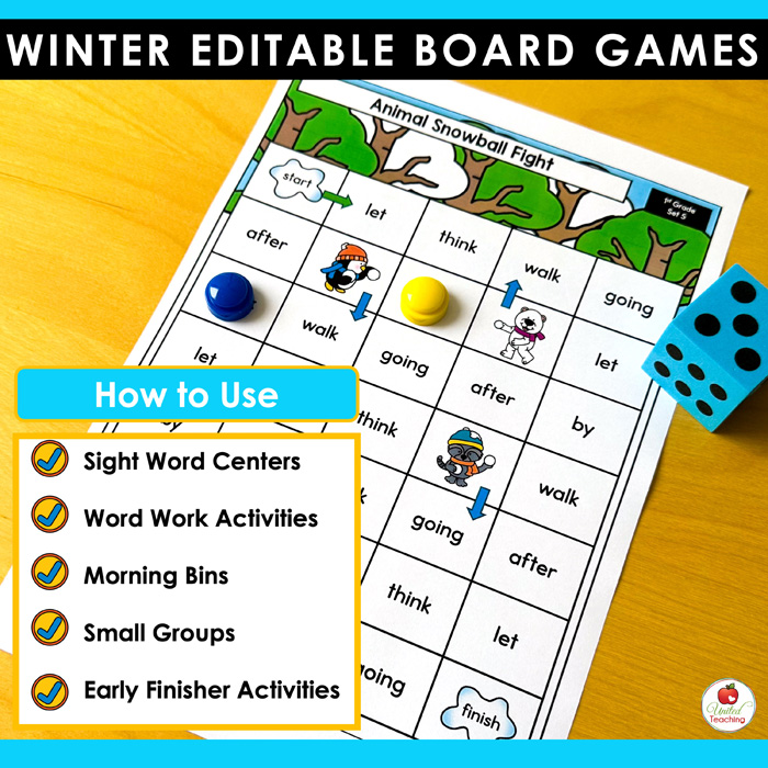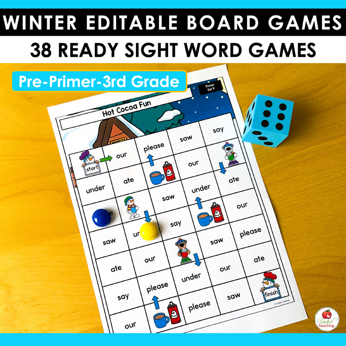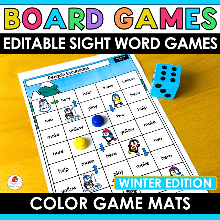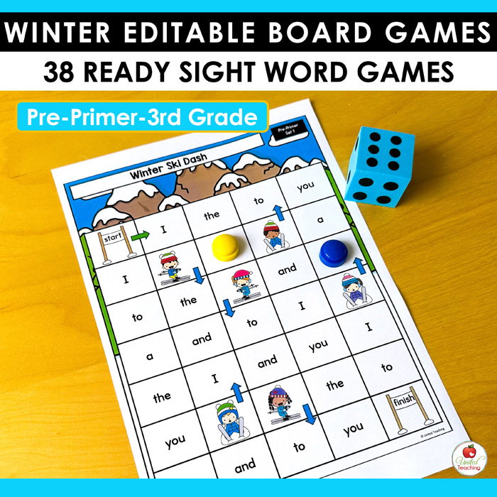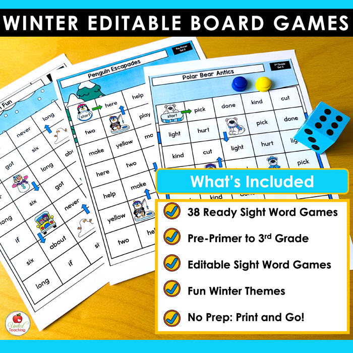 Make sight word practice fun and engaging with this collection of Winter Sight Word Game Boards! These dice board games are perfect for keeping students excited about reading as they roll a die, move the matching number of spaces, and read the sight words they land on. The game boards come in fun colorful designs and selected game boards are editable, making them versatile and easy to adapt to your classroom needs. With vibrant winter-themed designs, these sight word games are ideal for winter word work centers.