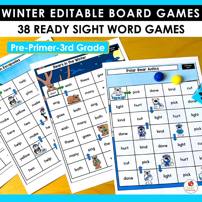 - 38 Winter Game Boards covering all sight words on the Pre-Primer to 3rd Grade lists.